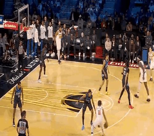 名局面,大頭延續運球虛晃,布萊克倒地,大頭一個后搖后撤步3分拔進
