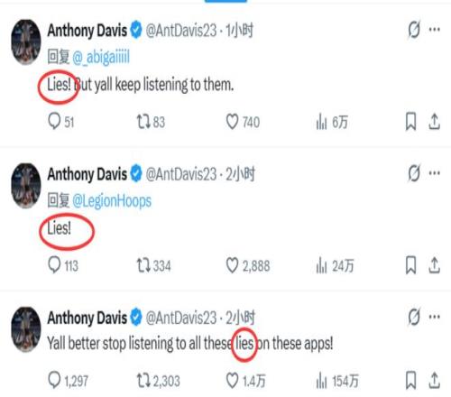 此前,名記Shams率先報道,戴維斯估量將接受左手韌帶修復手術,列席賽場數月。戴維斯對Shams的報道予以否認,并經過社交媒體停止反駁。“大家最好別再置信這些平臺上的謊言了。”戴維斯在社媒上寫道,隨后又在多條征引這一突發舊事的帖子下回復“謊言”二字。在明天將前往洛杉磯與手部專家會面后,濃眉確定無需接受手術。Shams隨后也修正了自己的報道,不過未來六周,濃眉是一定無法出場了。