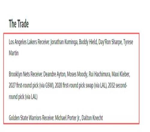 詳細(xì)買賣方案明細(xì)已基本敲定。洛杉磯湖人將送出八村塁、克萊伯、艾頓,失掉庫(kù)明加、希爾德、戴倫·夏普、馬丁四位即戰(zhàn)力球員;布魯克林籃網(wǎng)將送出邁克爾·波特二世、道爾頓·克內(nèi)希特,收獲艾頓、穆迪、八村塁、克萊伯,以及2027年膽小鬼首輪選秀權(quán)、2028年湖人首輪選秀權(quán)交流權(quán)和2032年湖人次輪選秀權(quán);金州膽小鬼則送出庫(kù)明加、希爾德、穆迪,失掉念念不忘的邁克爾·波特二世和克內(nèi)希特。
