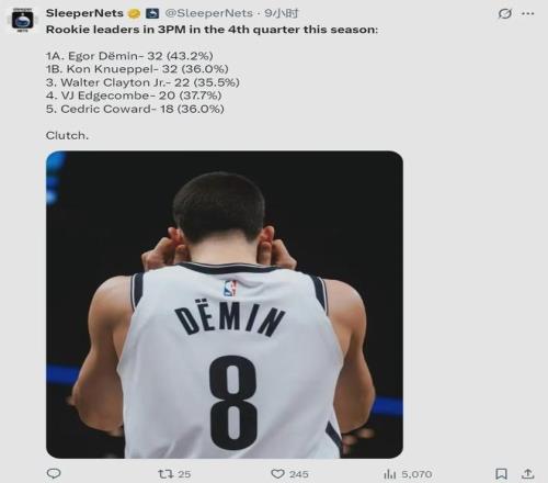 克尼佩爾無疑是三分火力最猛的2025屆新秀,本賽季他曾經(jīng)投進(jìn)166記三分,高居聯(lián)盟第三,僅次于庫里(175)和米切爾(175)。此外,克尼佩爾本賽季三分命中率42.5%,排名聯(lián)盟第19。但是,他在末節(jié)的三分命中率不如杰明。