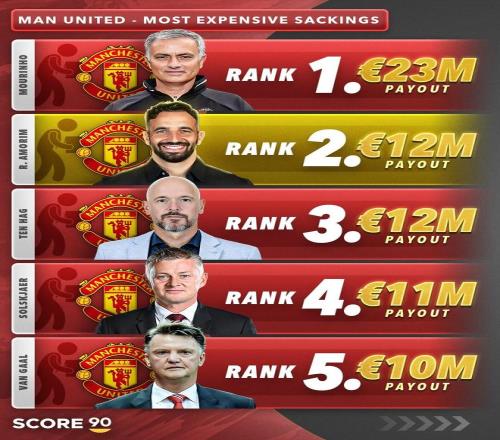 近日,Score90列出了曼聯歷任主帥解約賠償金排行榜,穆里尼奧的解雇費用位列第一,到達2300萬歐,而阿莫林與滕哈格以1200萬歐并列其后。