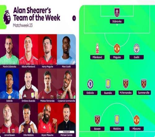 1月27日,英超官方發布了阿蘭-希勒評選的第23輪競賽的最佳陣容,其中西漢姆聯有3名球員中選,曼聯、維拉各有兩人,主教練為卡里克。